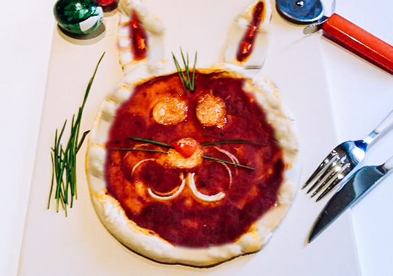 - Pizza mit Schnittlauch oder Basilikum Blättern garnieren um unseren Hasen lebendig zu machen!